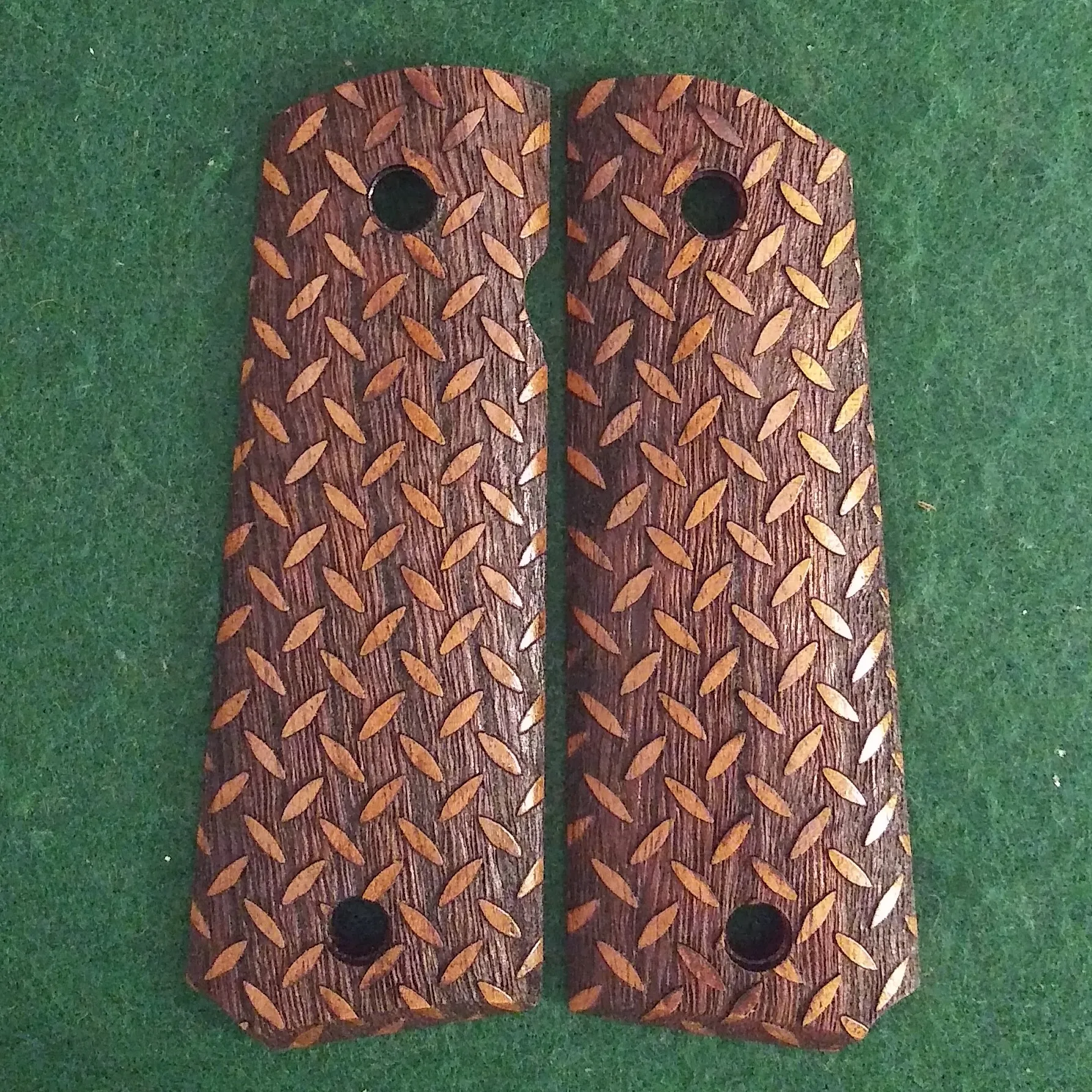 These Mesquite grips with Diamond Plate texturing fit the Full-Size 1911 pistols. They are also available in a variety of natural woods hand finished with lacquer, and laminated woods. See also this grip made out of our stock materials. Photo – Sample
